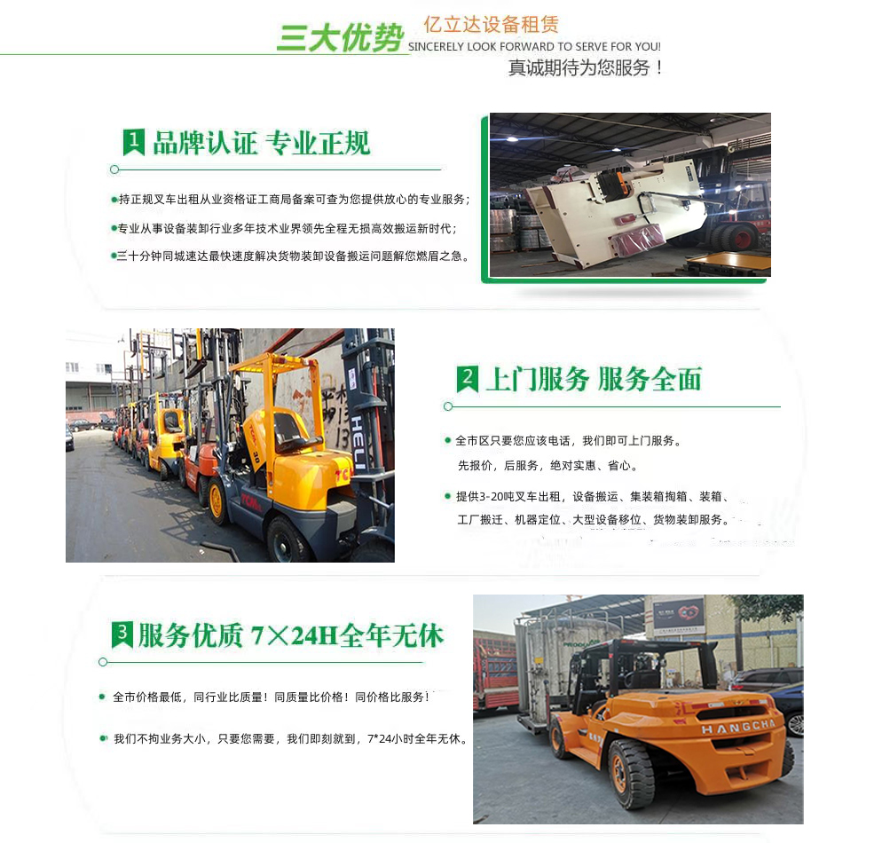 亿立达设备租赁有限公司是工商局准许的北京服装学院专业叉车出租公司,公司本着诚信、服务、效率、创新的经营理念,用精湛的技术,真诚的服务,为众多客户提供优质的服务,同时获得信赖与支持。专业提供北京服装学院3-20吨叉车出租、叉车租赁、设备搬运、集装箱掏箱装箱、机器移位定位、货物装卸、工厂搬迁、安全可靠,收费透明,价格便宜,随叫随到,24小时上门服务!本公司叉车吊车师傅对各种设备搬运装卸都有深刻探讨和研究。很多的疑难设备搬运,通过我公司的叉车师傅都能迎刃而解。对各种进口设备、国产机器、大型设备搬迁、高难度搬迁、各种精密仪器、医疗设备、科研设备等都能搬运; 提供全市 24 小时上门装卸搬运服务。同时提供厂房搬迁服务。 ...